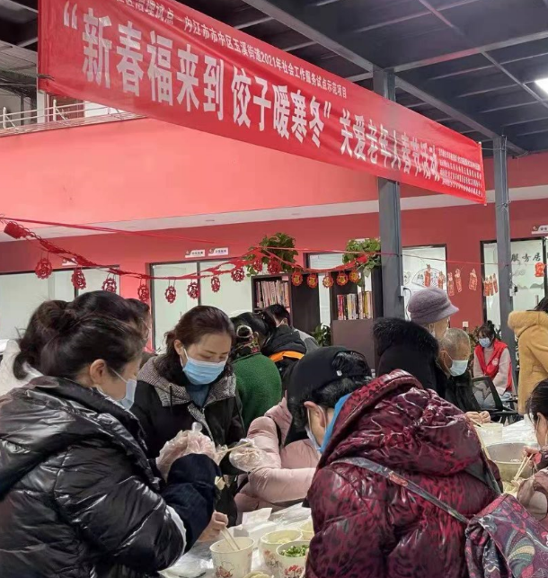 春节将至,内江市市中区怡德养老服务中心与玉溪街道社工站积极配合,采用包饺子的形式过春节,让老年人们都参与其中。感受春节的节日氛围,即增强了老人的动手能力,又提升了自我认同感,得到精神上的满足。同时拓宽老年人的社交渠道和朋友圈,提升老年人社交的能力,拉近社区内邻里关系,使他们在集体活动中提高合作意识。
