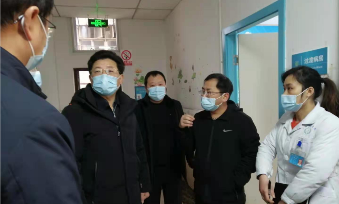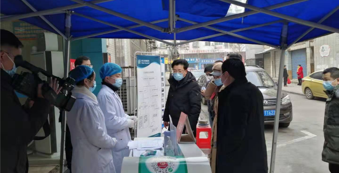 蒋学东在医院门口预检分诊处、一楼发热门诊详细检查体温检测、健康码查验、发热门诊预检、核酸检测、血液透析病人体温检测登记等工作,二楼儿科住院病区检查疫情防控工作重点落实情况。