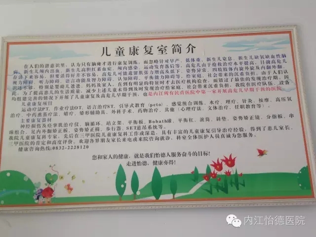 内江怡德医院是全市唯一的一家以治疗儿童疾病为特色的民营现代化医院。从怡康诊所发展而来,治疗儿童疾病已有二十年历史。在著名儿科专家罗伟院长的带领下,旗下儿科专家团队势力雄厚,不论是儿童疾病、儿保、儿童康复都很有特色!前来就诊者络绎不绝。