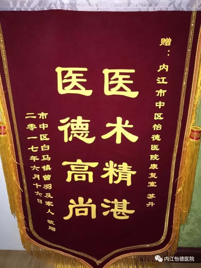 2017年6月19日下午,患儿杨洋的母亲专程来到怡德医院儿童康复室,对康复室的医护人员表示了谢意。并赠送了锦旗,“医德高尚、医术精湛”八个金光闪闪的大字,是对医院医护人员的肯定。